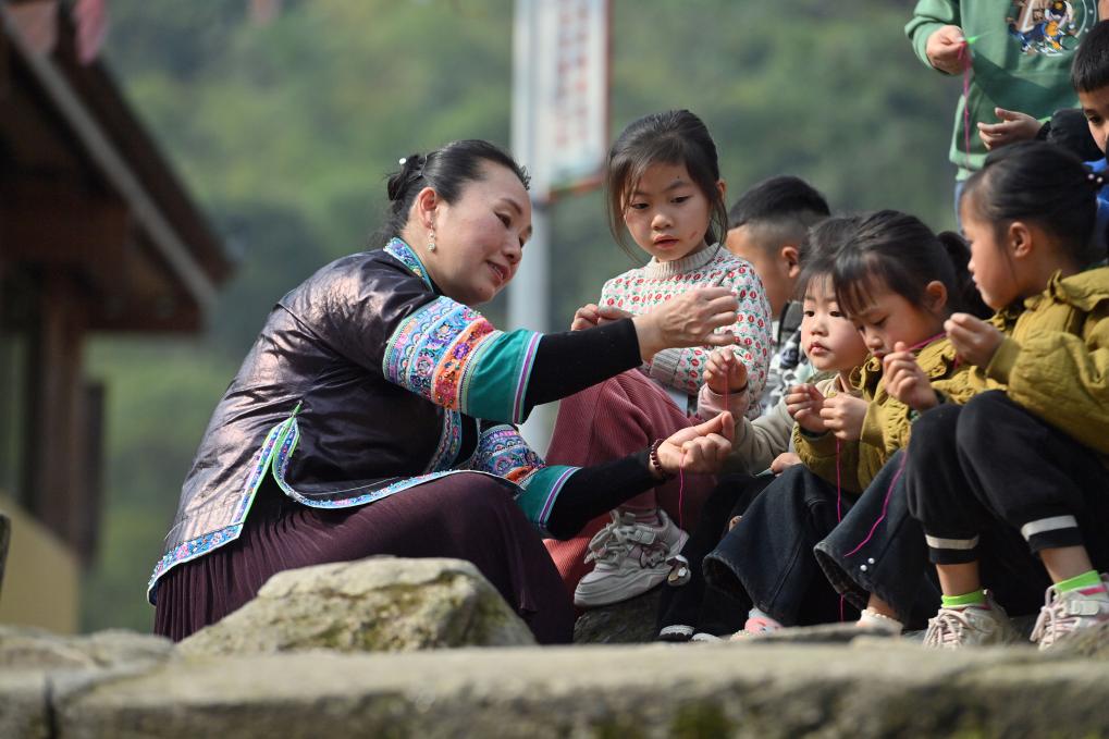 在广西柳州市融水苗族自治县杆洞乡党鸠村,杨洪英(左一)在指导小学生学习刺绣知识(3月3日摄)。