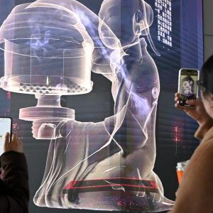 2月25日,河北博物院裸眼3D文物数字展对长信宫灯进行展示。 中新社记者 翟羽佳 摄