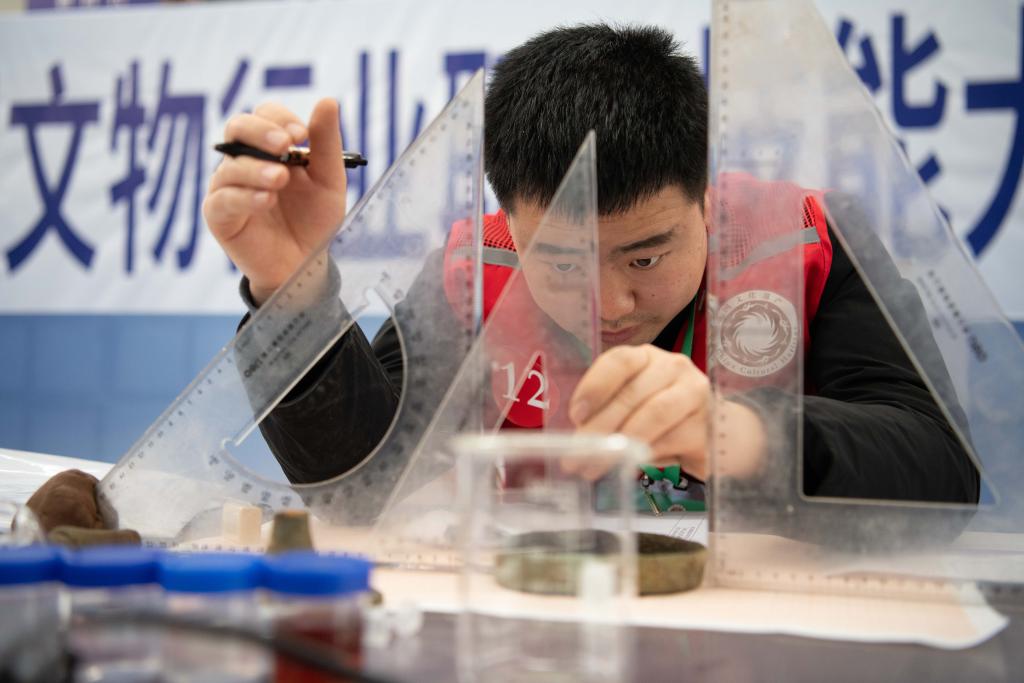 3月6日,参赛选手在参加金属文物修复师项目比赛。