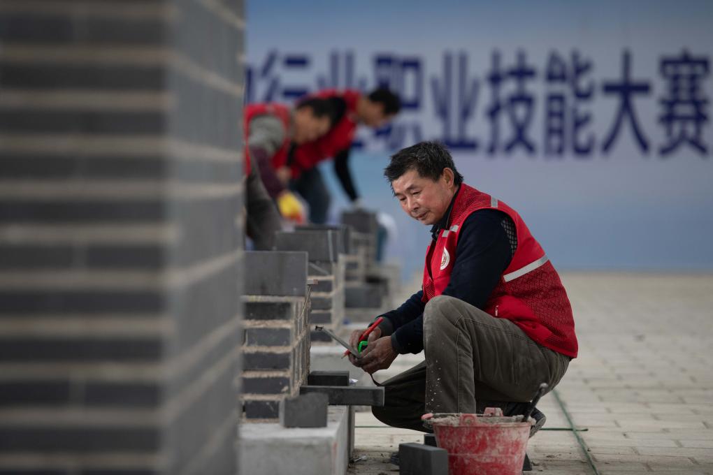 3月6日,参赛选手在参加泥瓦作文物修复师项目比赛。