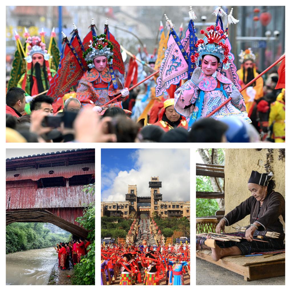 图片分别为春节期间民俗活动(上,新华社记者邹竞一摄)、浙江庆元县的木拱桥(下左,吴春平摄)、四川阿坝羌年庆祝活动(下中)、黎族织锦技艺(下右,新华社记者蒲晓旭摄)。 中华文化灿若星河