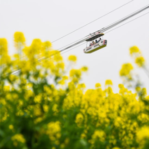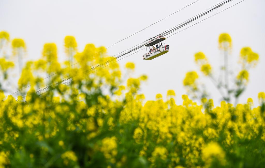 3月12日,游客乘坐观光缆车在重庆潼南崇龛花海景区游览。