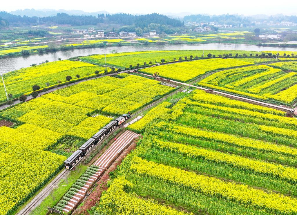 3月12日,游客乘坐“小火车”在重庆潼南崇龛花海景区游览(无人机照片)。
