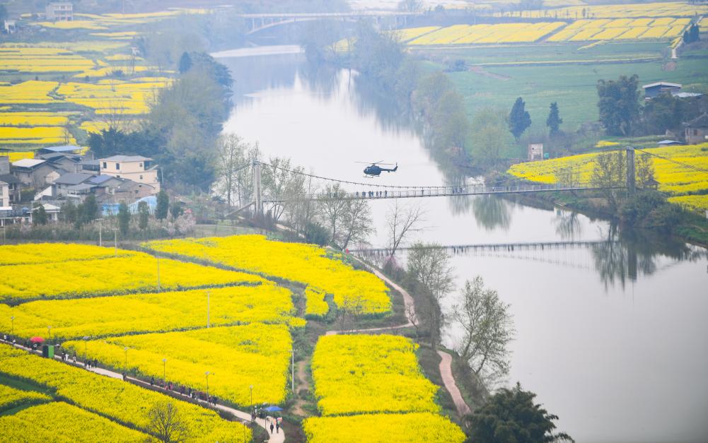 3月12日,游客乘坐直升机在重庆潼南崇龛花海景区游览。