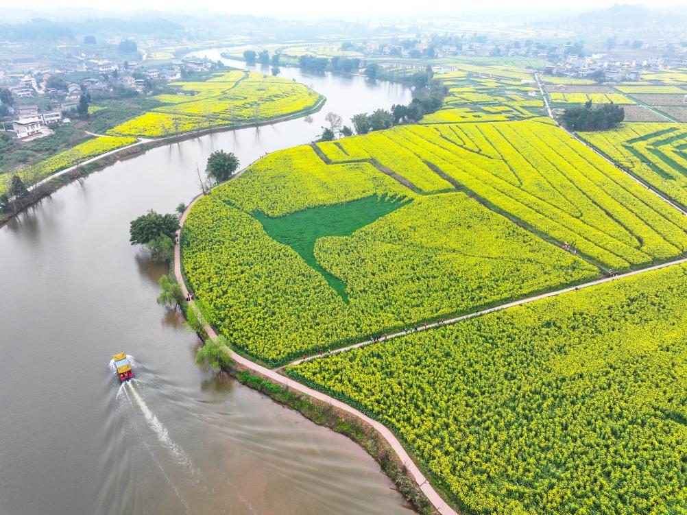 3月12日,游客乘坐游船在重庆潼南崇龛花海景区游览(无人机照片)。
