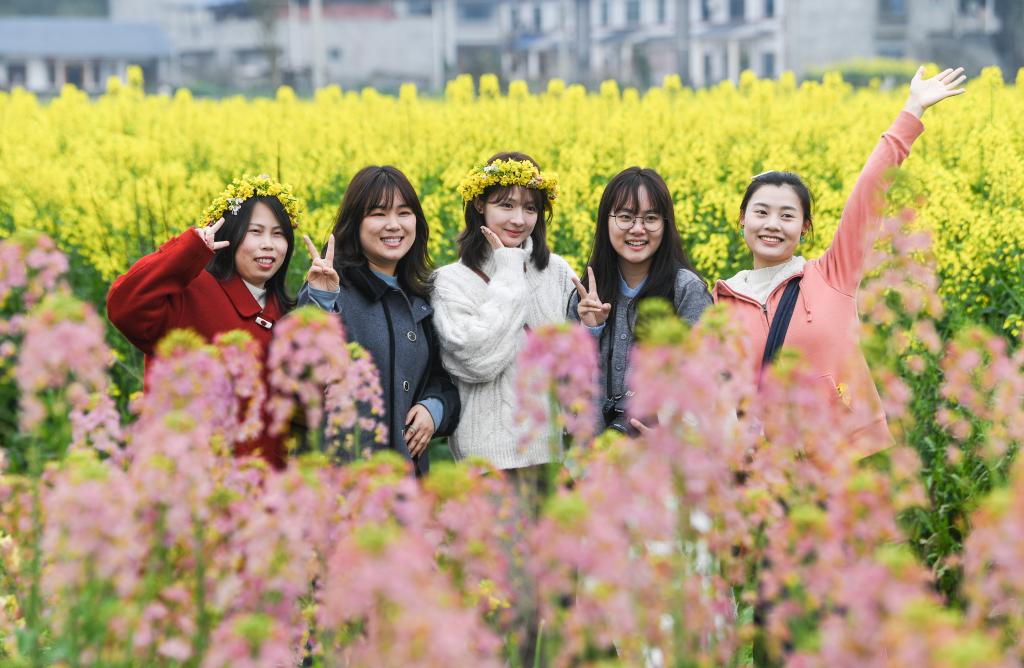 3月12日,游客在重庆潼南崇龛花海景区游览、拍照。