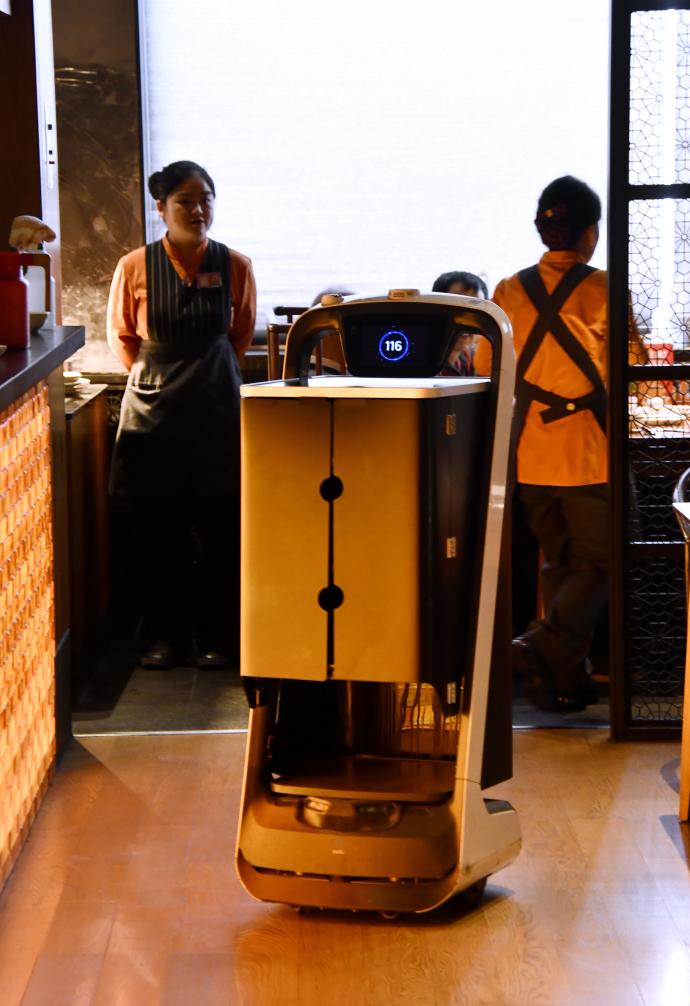 在全聚德烤鸭店和平门总店拍摄的送餐机器人(3月13日摄)。