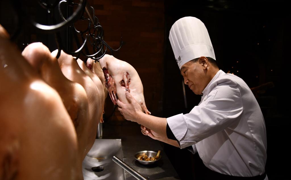 全聚德烤鸭店和平门总店的一位技师准备为顾客片切烤鸭(3月13日摄)。
