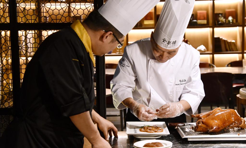 全聚德挂炉烤鸭第六代传承人、高级烹饪技师吴玉波(右)在为学生传授经验(3月13日摄)。