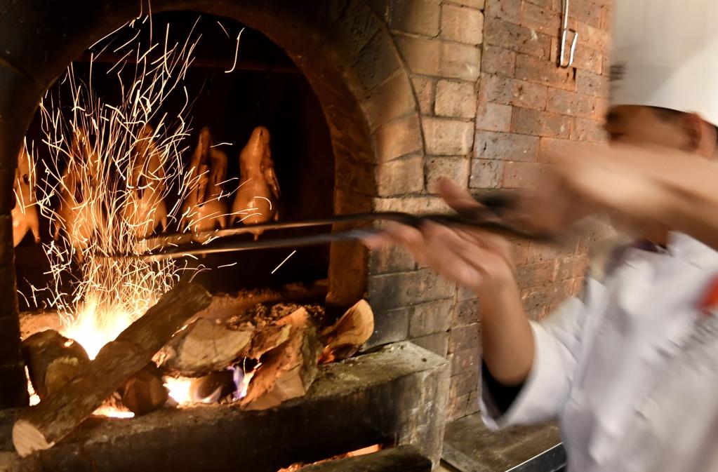 在全聚德烤鸭店和平门总店的传统挂炉中烤制的烤鸭(3月13日摄)。
