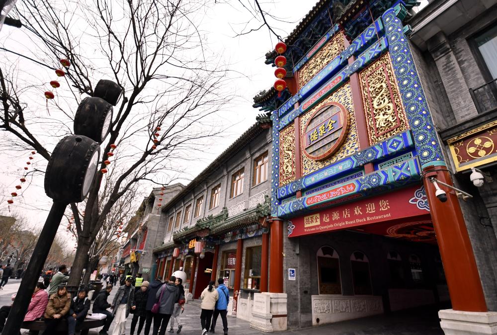 位于北京前门步行街的全聚德起源店(3月14日摄)。