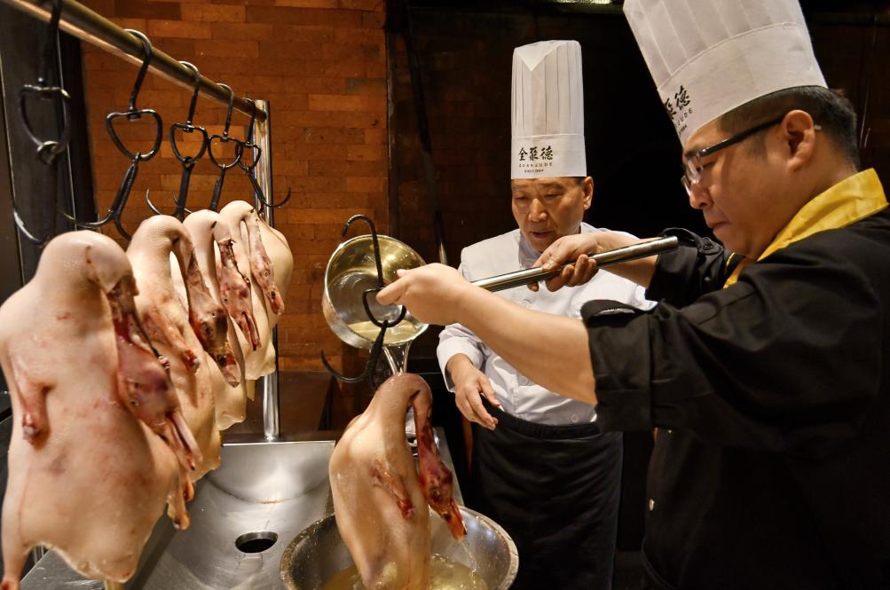 北京烤鸭是北京的美食名片。2008年烤鸭技艺(全聚德挂炉烤鸭技艺)被列入第二批国家级非物质文化遗产名录,如今全聚德挂炉烤鸭这项技艺已经经过了七代师徒传承。