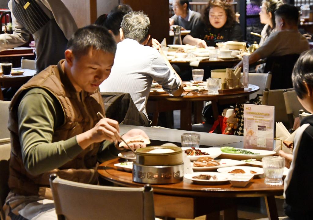 顾客在全聚德烤鸭店和平门总店品尝挂炉烤鸭(3月13日摄)。