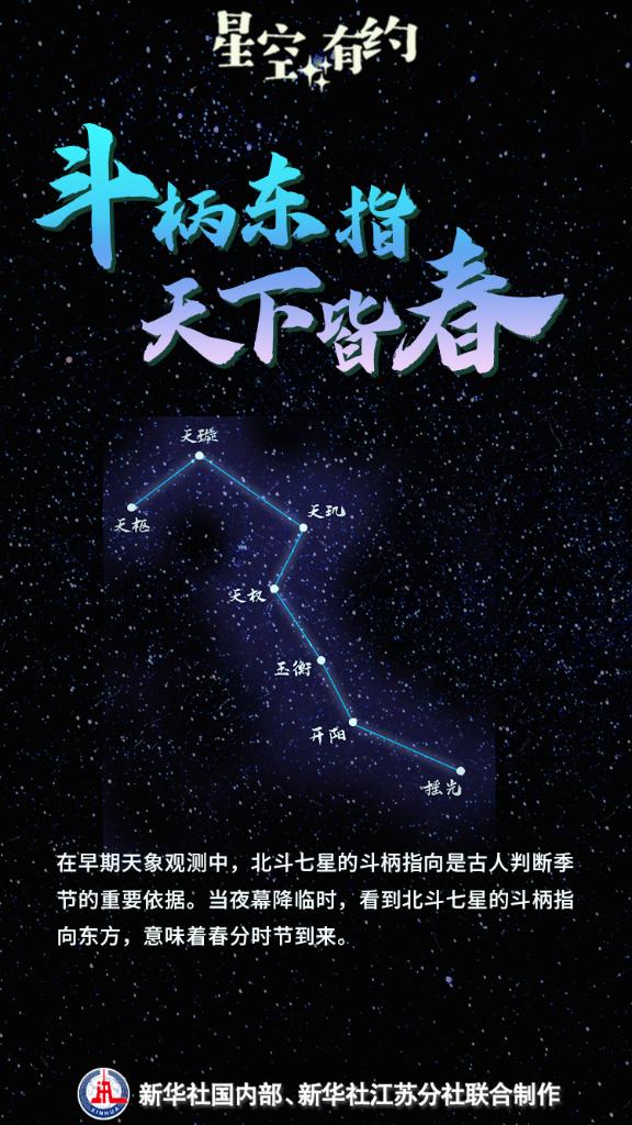 3月20日将迎来春分节气。这一时节草长莺飞、花满枝头,天上的星斗也指示着春天的到来。我国古代有“斗柄东指,天下皆春”的说法,意思是当夜幕降临时,看到北斗七星的斗柄指向东方,意味着春分时节到来。