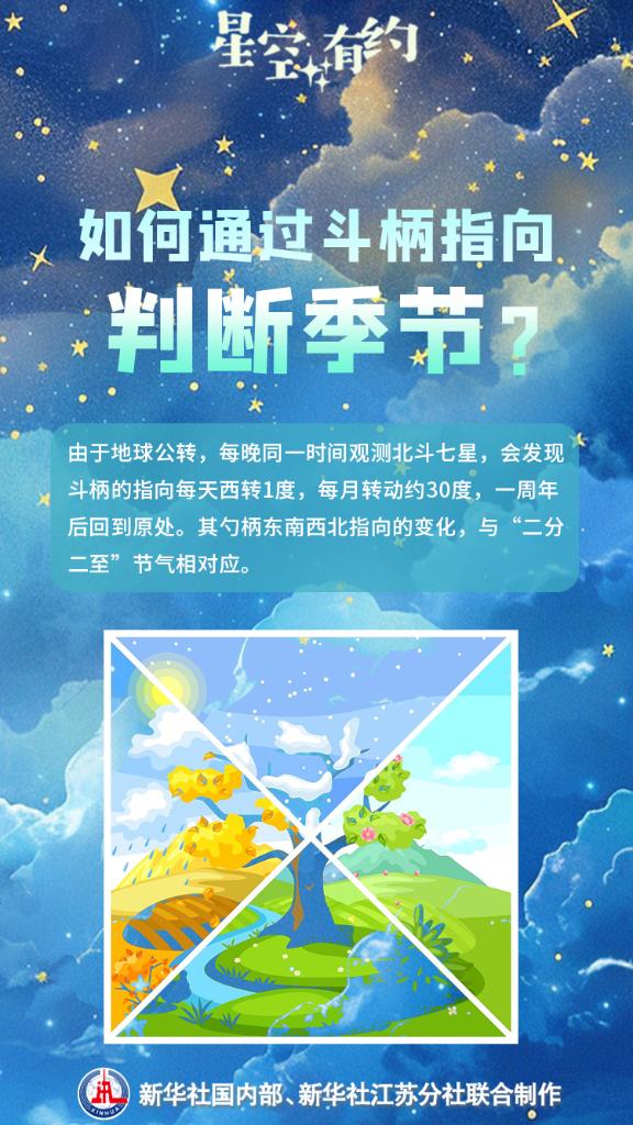 由于地球自转轴指向北极星方向,从地球上看,北斗七星每天围绕着北极星做圆周运动。“因此,古人用北斗七星判断季节的方法相对粗略,适合日落后的入夜时分。随着时间推移,斗柄的指向会有明显变化。例如,春季天黑后不久,斗柄大体指向东方,但到午夜就转向南方,天亮前则指向西方。”王科超说。