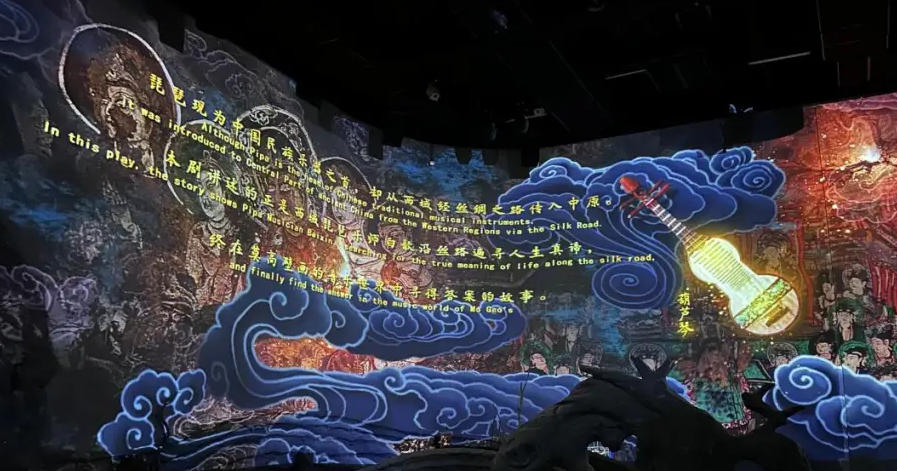 虚拟现实(VR)与增强现实(AR)技术让敦煌文化触手可及。2023年“云游莫高窟”项目运用VR技术,用户戴上头显即可360度漫游洞窟,近距离感受九色鹿、飞天神女的灵动细节。2024年9月,“敦煌文化周”在哈佛大学推出AR体验,观众扫描展品即可见证壁画“复活”,如反弹琵琶舞姿的动态演绎,栩栩如生。2024年8月“敦煌文化环球连线——走进中华文明(美国、巴哈马专场)”首次实现全球直播,使用5G技术以实时渲染与低延迟传输,用户可在线切换视角,沉浸式体验数字博物馆,吸引数万海外观众观看,拉近了文化与受众的距离。
