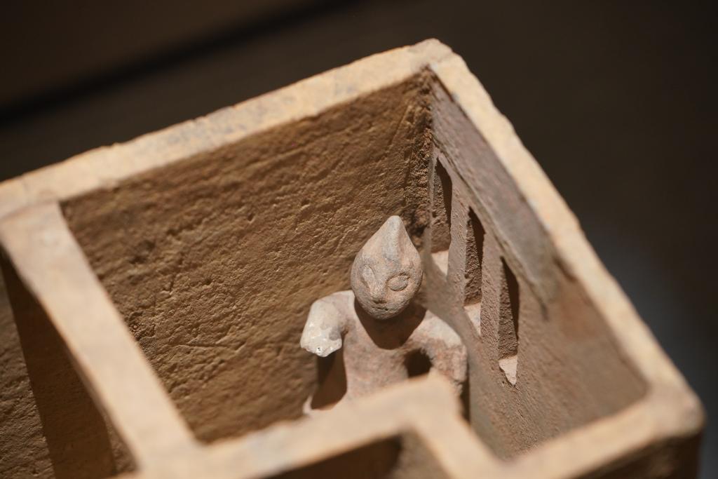 据博物馆工作人员介绍,这件名为陶房干栏式含陶俑的文物由陶俑和干栏式建筑模型组成。其中陶俑表情生动,头戴造型别致的冠帽,其夸张的眉眼轮廓与“奥特曼”确有几分神似。