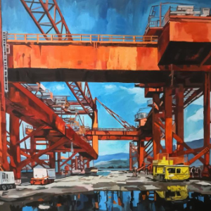 《奋进者的征程》以大型工业园区为背景,画面中高耸的智能生产线、交错的输变电网络与繁忙的物流系统构成了一幅充满张力的现代化图景。值得注意的是,画作远景中若隐若现的跨境智慧口岸与5G基站,巧妙呼应了当下中国与东盟深化数字合作的趋势。这些“数字引擎”正推动区域产业链升级,为全球工业发展注入新动能。