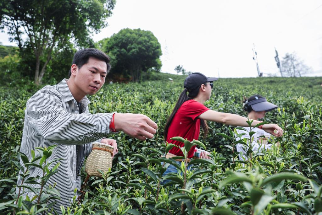 4月16日,参加茶文化主题活动的市民在建德市新安江街道岭后大坪茶园体验采茶。