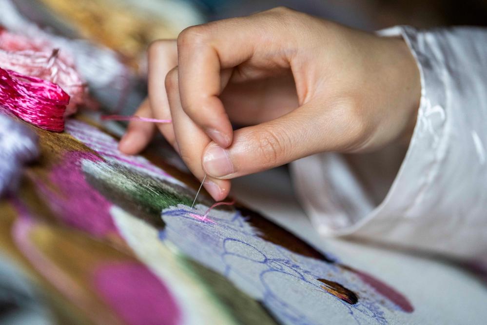 4月16日,在桃源县郑家驿镇梨子岗村齐绘绣庄,肖瑶在进行刺绣创作。