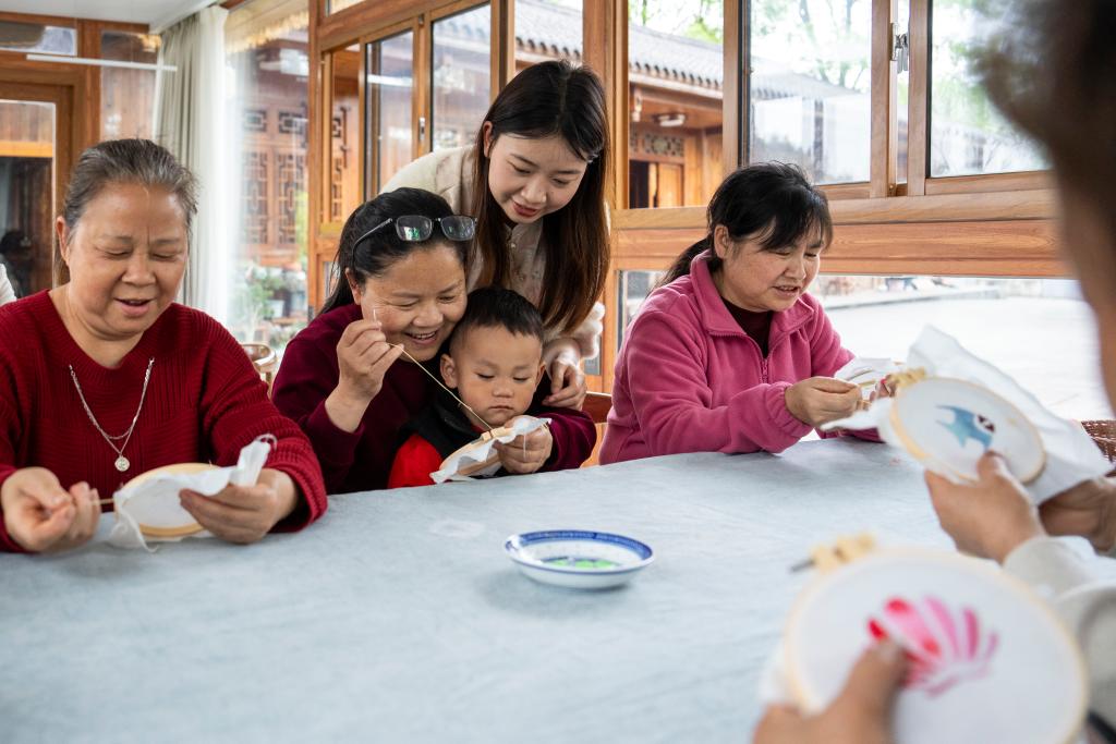 4月17日,在桃源县郑家驿镇梨子岗村齐绘绣庄,肖瑶(右二)带领周边妇女学习刺绣技艺。