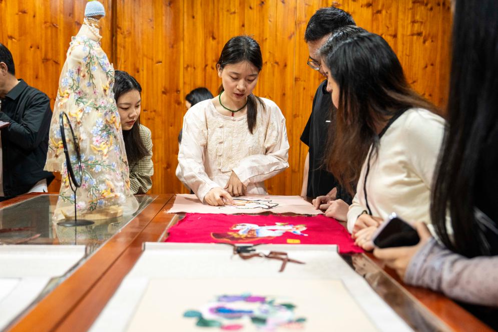 4月16日,在桃源县郑家驿镇梨子岗村齐绘绣庄,肖瑶(中)向游客介绍刺绣作品。
