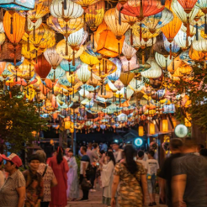 新华社南昌4月29日电(记者张东阳、黄和逊)夜幕降临,华灯初上。走进江西省铅山县葛仙村内,缥缈的水汽云雾中,飞檐高阁流光溢彩,一派汉唐盛世之景。游客们身着汉服,穿行于亭台水榭之中,赏花灯、喂锦鲤、听琴瑟合奏、观火壶腾挪,纷纷乐在其中。