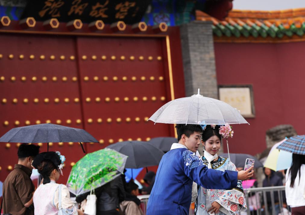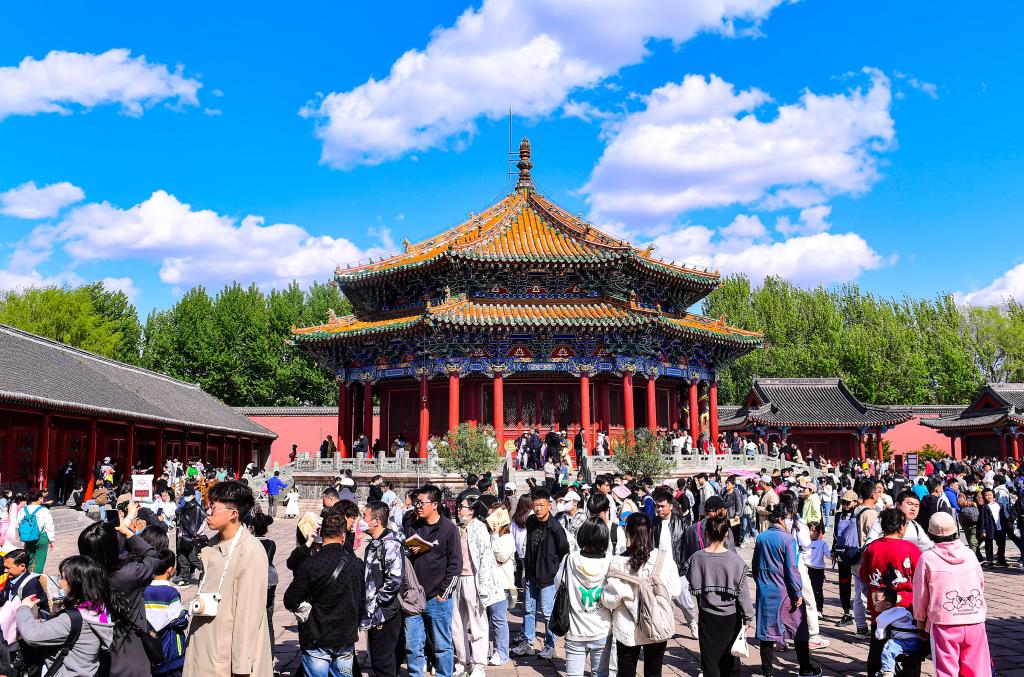 2025年5月3日,游客在沈阳故宫门前打卡拍照。