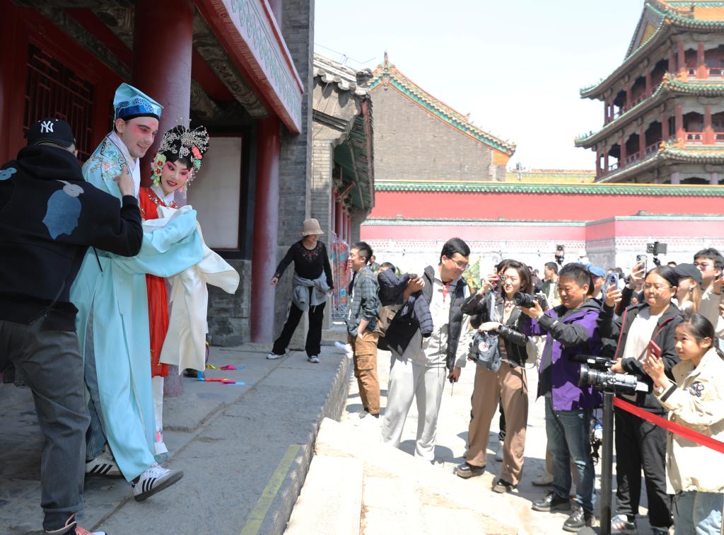 2024年4月30日,在沈阳故宫,来自俄罗斯的芭蕾舞演员与沈阳京剧院的演员互动。