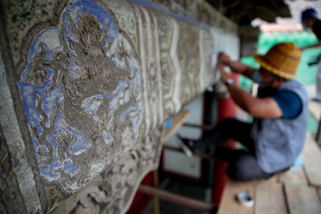 2020年6月30日,工作人员在沈阳故宫进行古建筑油饰彩画保护修复工作。