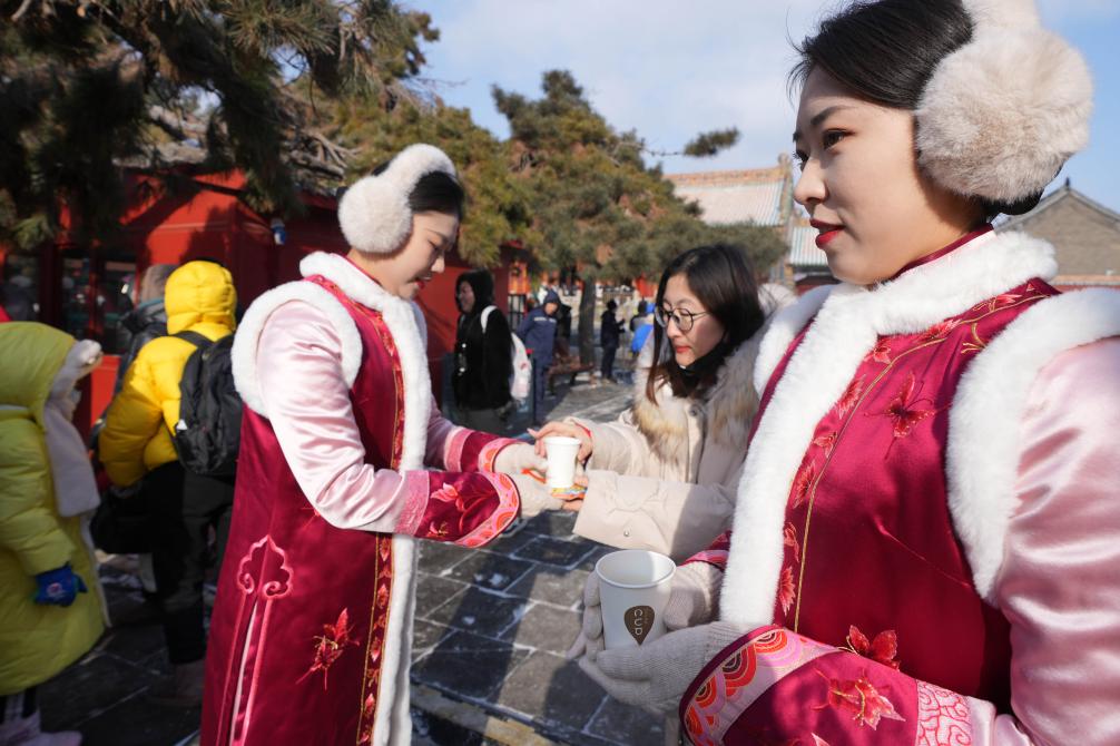 2024年1月21日,沈阳故宫工作人员为游客提供姜糖水和暖贴。