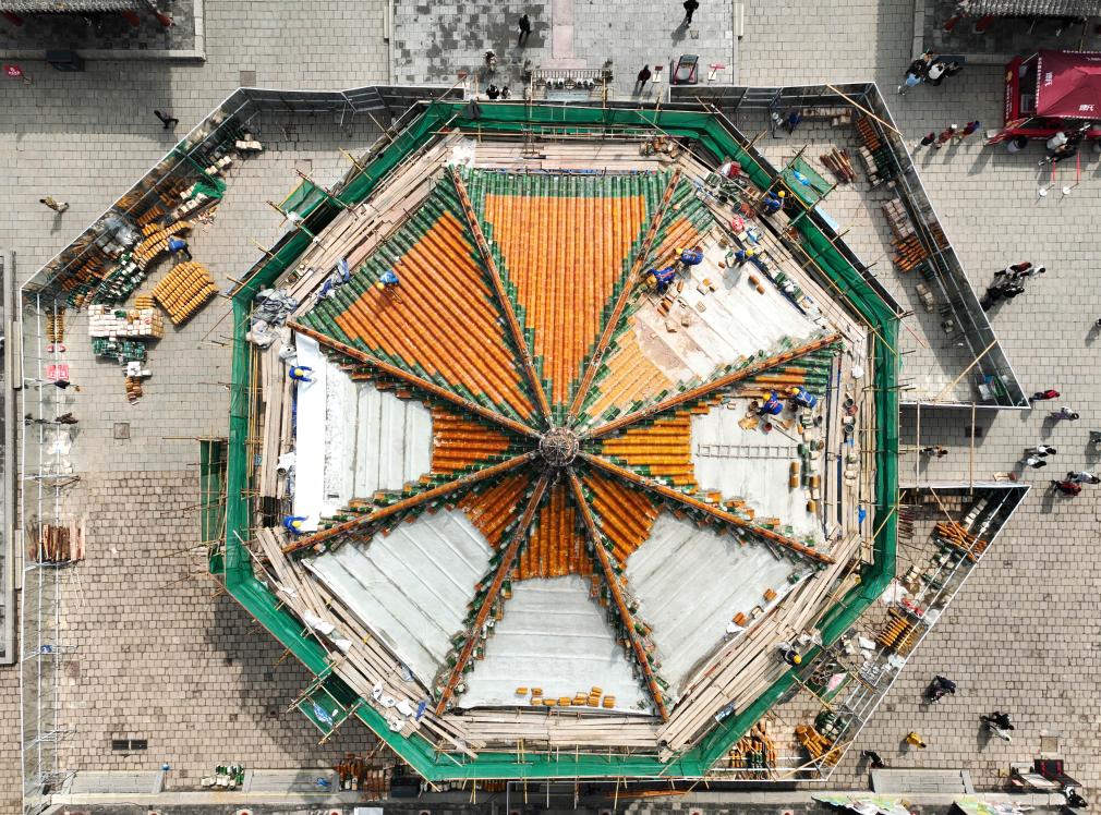 这是2025年4月6日拍摄的保养维护中的沈阳故宫大政殿(无人机照片)。 “沈阳故宫过大年”系列活动