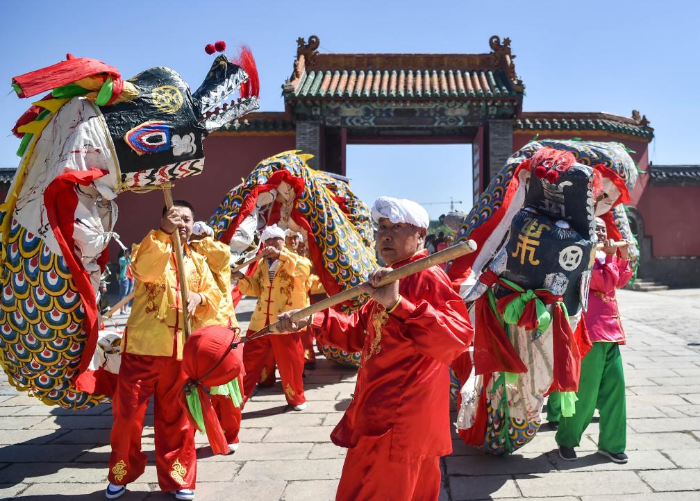2017年6月10日,张氏皇苑龙舞龙技艺代表性传承人张仲发(前)带队在沈阳故宫表演。