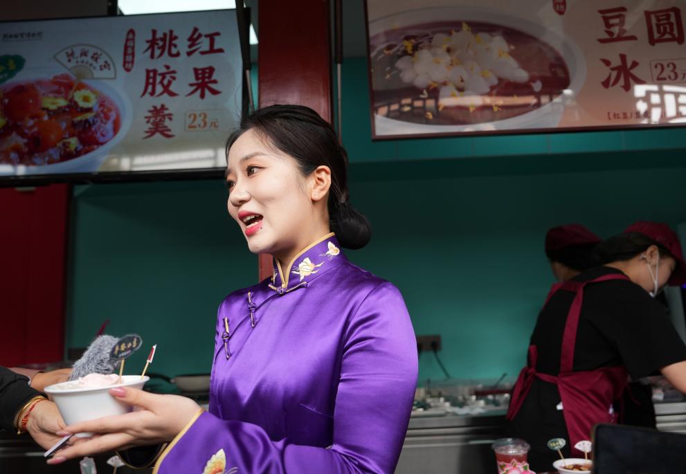 2024年5月10日,沈阳故宫博物院讲解员为游客介绍美食文创产品。