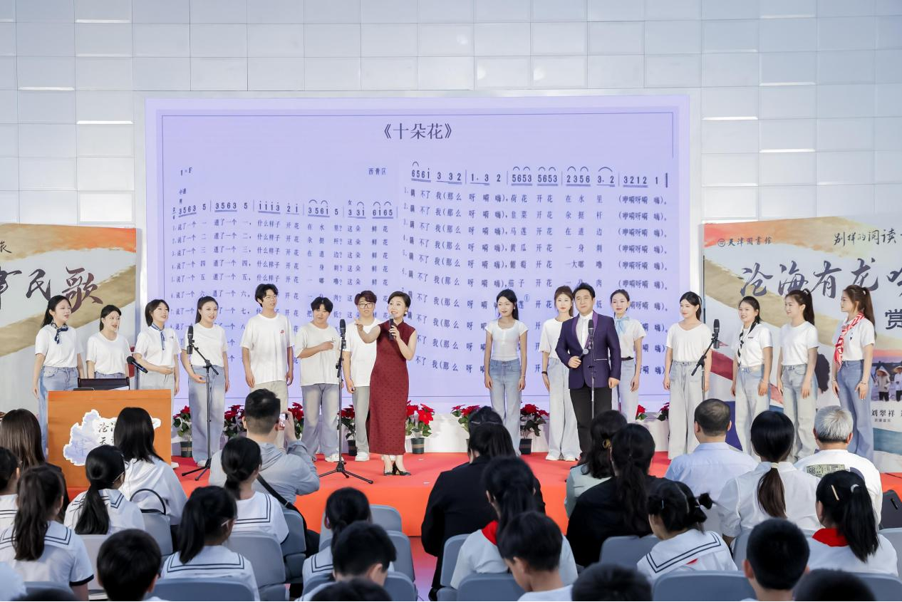 在民歌赏读环节,男高音独唱演员赵天刃、天津师范大学音乐与影视学院声乐系教师刘慧慧接连演绎了《画扇面》《莲花落》《十朵花》等天津民歌,让听众感受到天津民歌在传承与创新中展现出的韧性与活力。