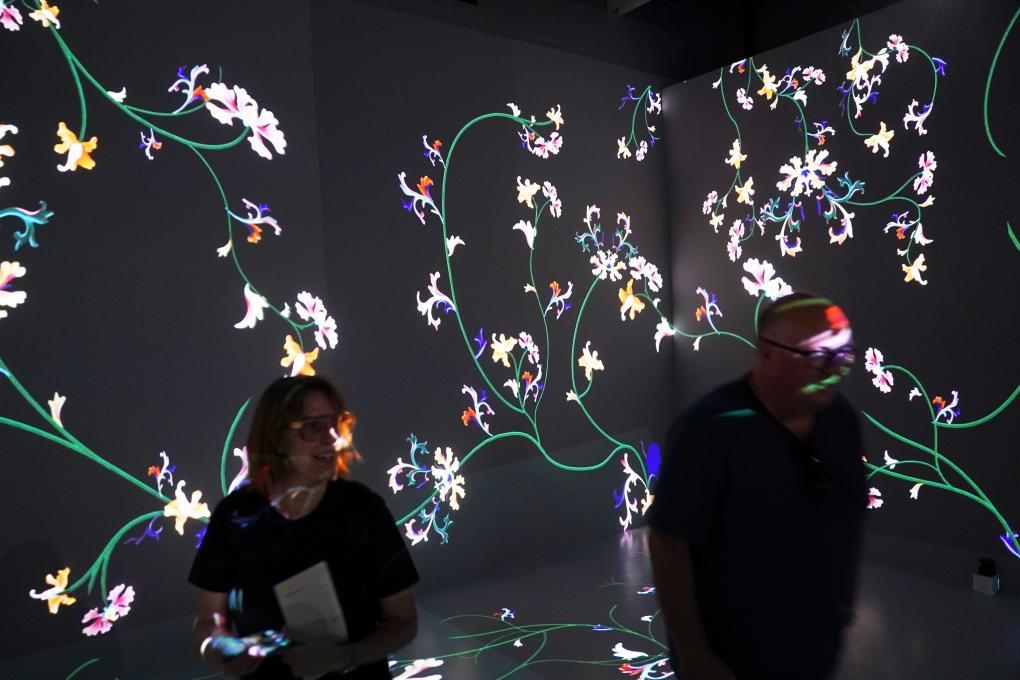5月14日,在香港故宫文博馆,参观者在沉浸式体验数字化的故宫建筑、陶瓷、织绣等文物上的传统纹样。