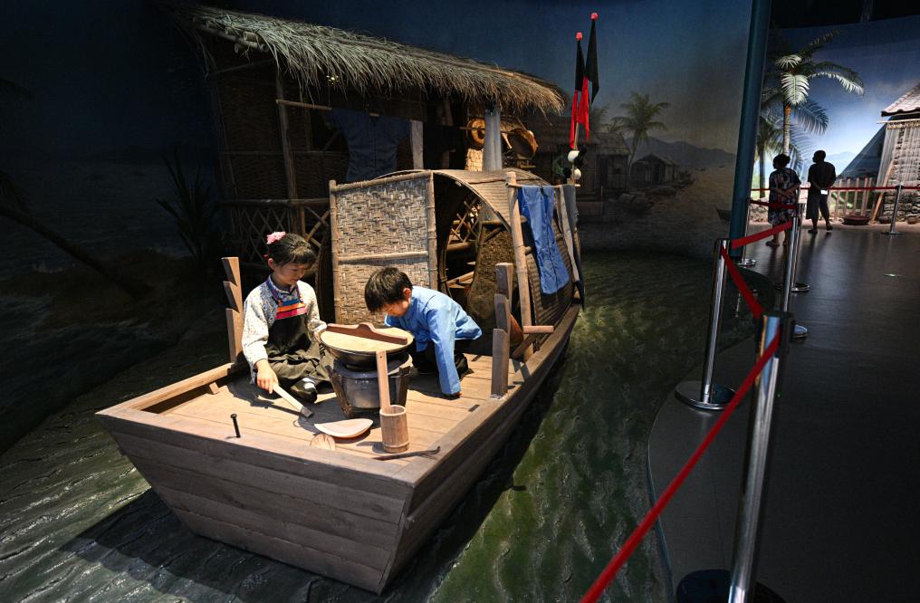 5月13日在海南疍家博物馆拍摄的展示疍家人生活在住家船上的场景。早期疍家人大多居住在船上,每户一般有一至两艘船用于作业和居住。