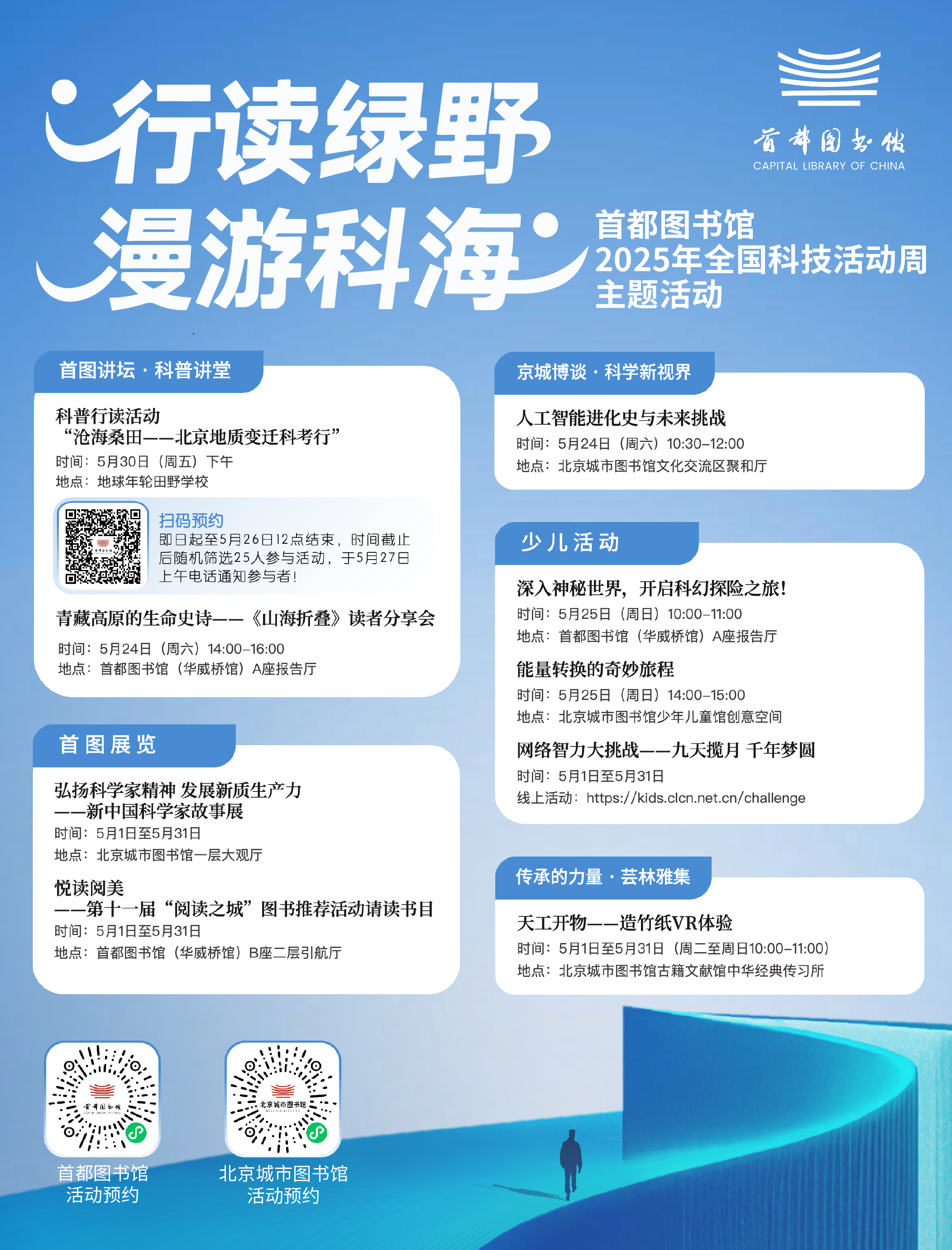 5月24日,在第25个全国科技活动周之际,首都图书馆围绕“行读绿野 漫游科海”主题,精心策划了科普行读、数字素养课程、图书分享、科学家故事展等多项科技活动。