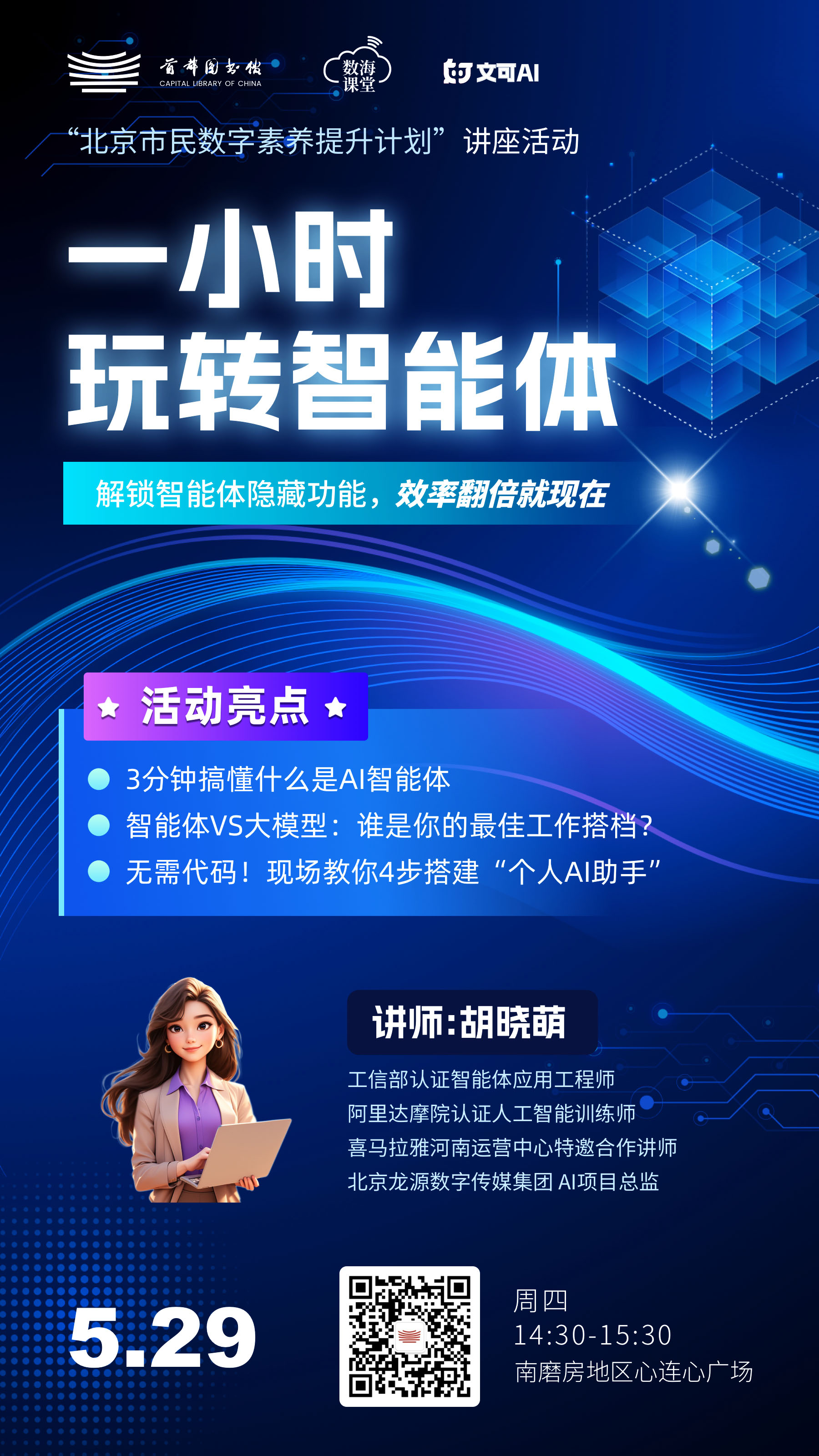 为响应国家数字化发展战略,提升北京市民数字素养和数字技术应用能力,首都图书馆开启了“北京市民数字素养提升计划”。5月29日,讲座将走进社区,为居民普及AI智能体应用,以沉浸式互动体验进一步引导读者掌握AI技能。