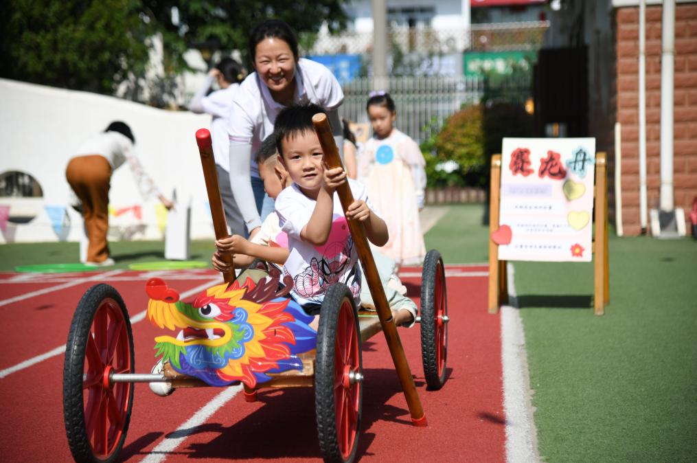 5月28日,在陕西省西安市明园幼儿园,小朋友体验“赛龙舟”游戏。