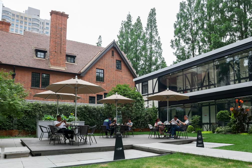 5月31日,人们在位于上海市长宁区新华路的一尺花园(安和花园店)咖啡馆前喝咖啡。