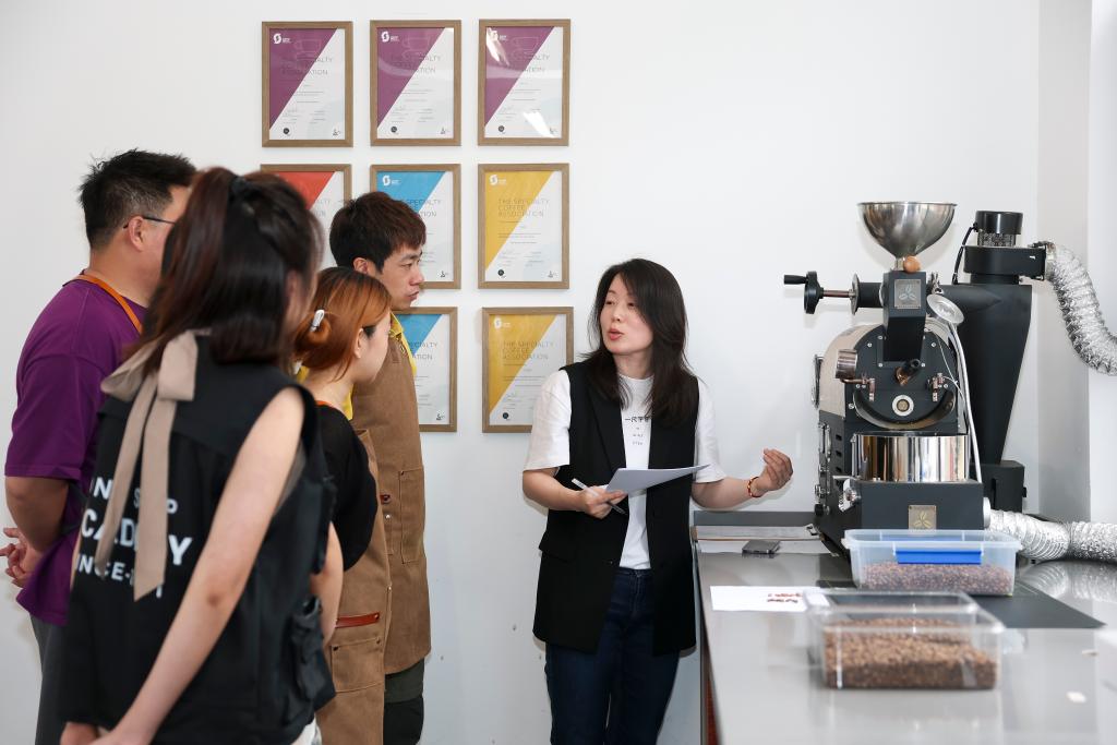 在一尺见学咖啡培训学校,咖啡烘焙师蔡晓丽为学员讲解咖啡烘焙技巧(5月22日摄)。