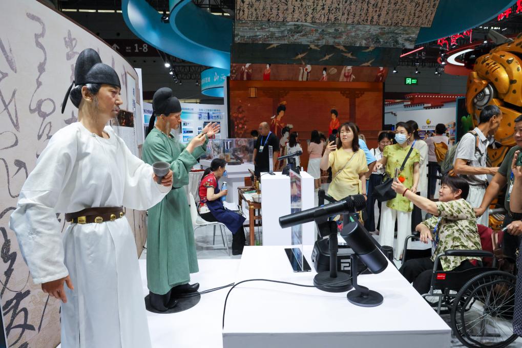 记者在现场看到,人工智能展区全面展示了“AI+文化”的各种应用场景。人形机器人利用灵活的手指,熟练地弹奏古筝;扫描二维码,沉浸式体验甲骨文、敦煌藏经洞、北京中轴线,博大精深的中华文明用最新的形式呈现出来。
