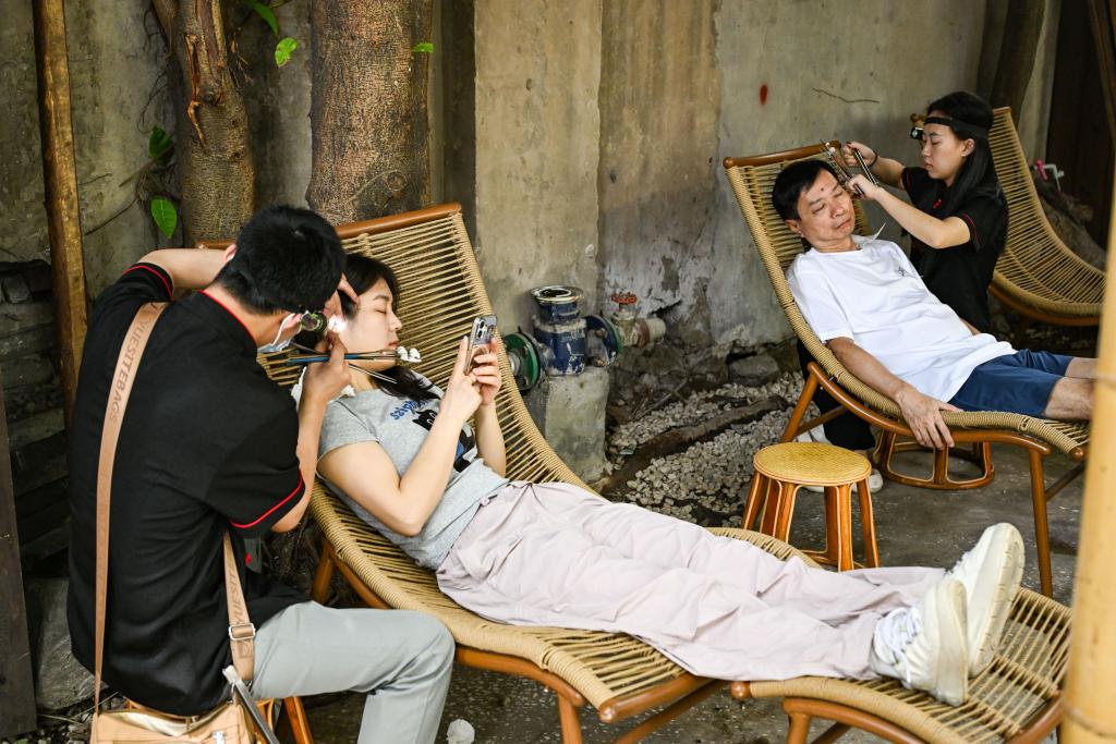6月8日,游客在重庆市渝中区山城巷体验采耳服务。