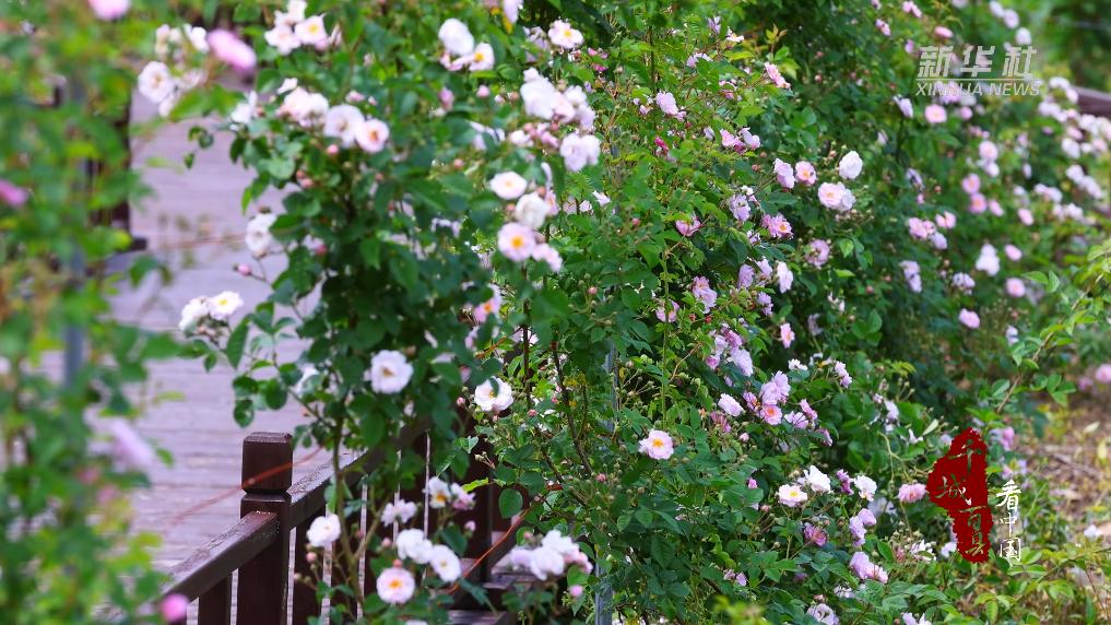 初夏的吉林省集安市凉水朝鲜族乡,百亩玫瑰与月季沿长白山脉次第绽放,铺展成绚烂花毯,粉、红、白三色花海随山势起伏,微风拂过,花枝摇曳间花香沁脾。漫步在花间栈道,可赏“一半山色,一半花海”的美景。