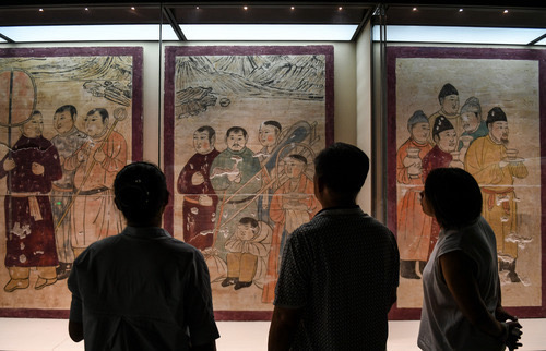 辽上京周边贵族墓葬出土的壁画也是辽上京博物馆的特色藏品。这些壁画真实再现墓主人生前生活场景,如宴饮、出行、歌舞、侍奉等。在汉人墓葬壁画中,人物着装呈现契丹化倾向,而契丹人墓葬壁画上,不乏湖石牡丹、花鸟条屏等中原文化元素。