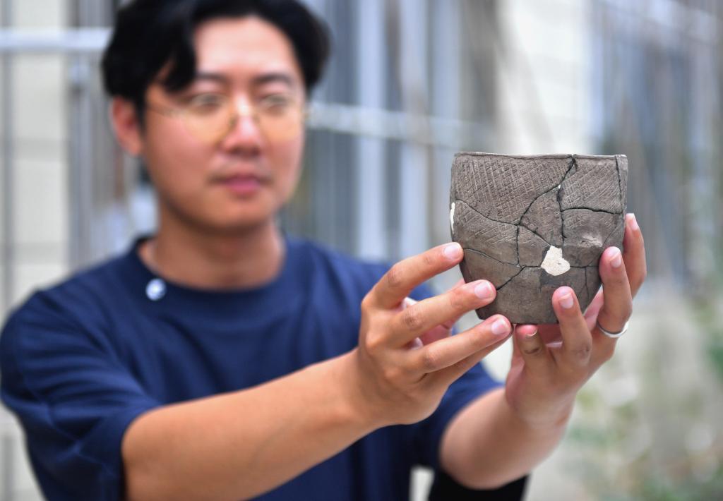 6月18日,宣化郑家沟遗址考古发掘项目执行领队龚湛清在展示出土的筒形罐。