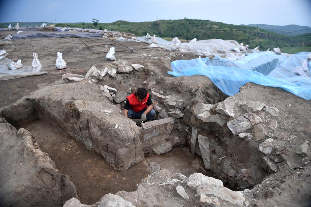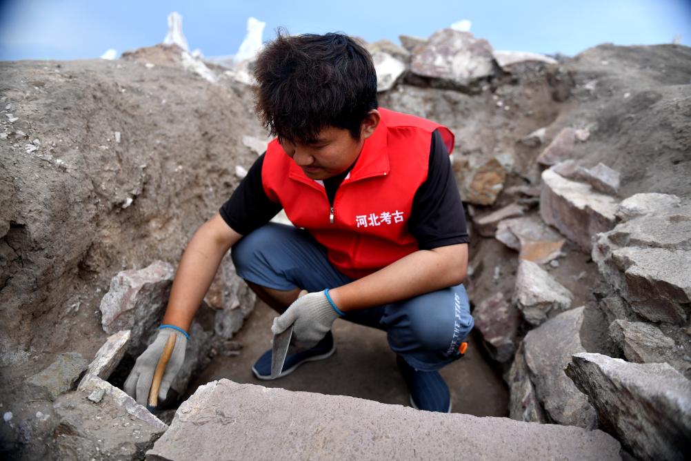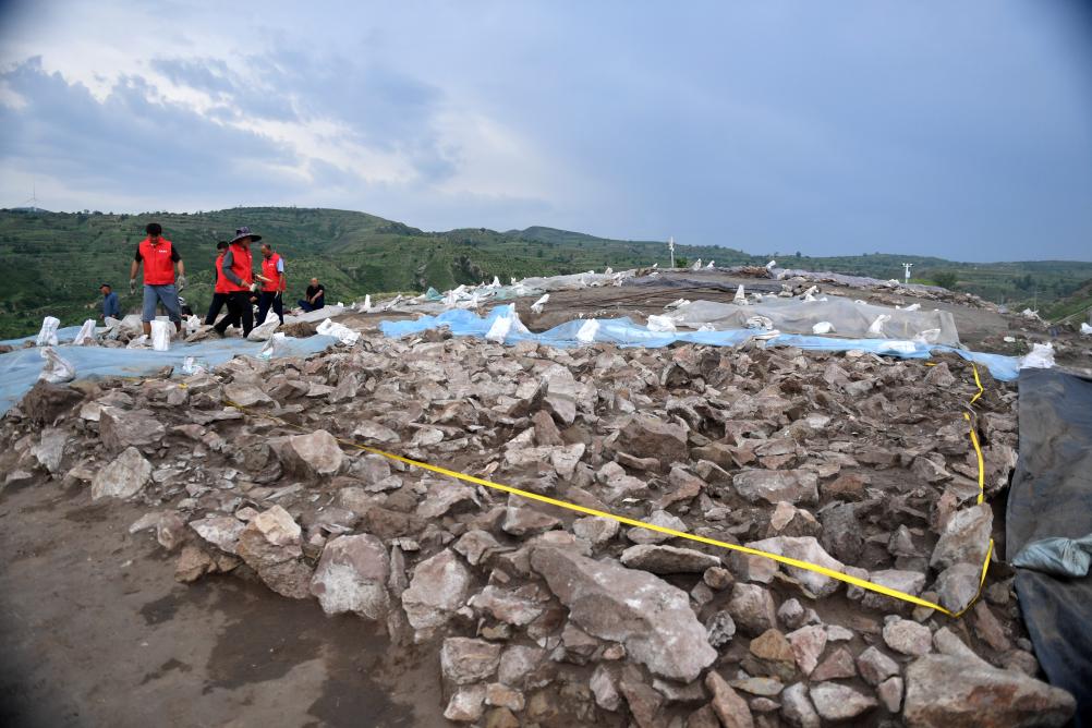 6月18日,宣化郑家沟遗址考古发掘项目队员在一号积石冢工作。