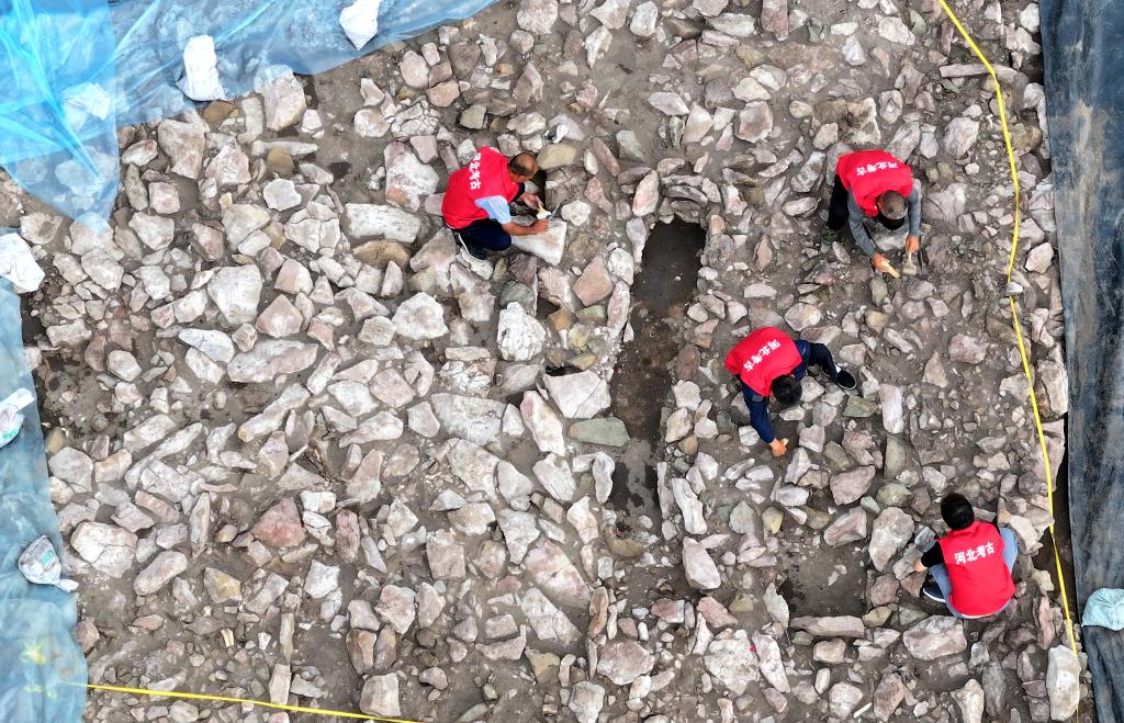 6月18日,宣化郑家沟遗址考古发掘项目队员在一号积石冢工作(无人机照片)。