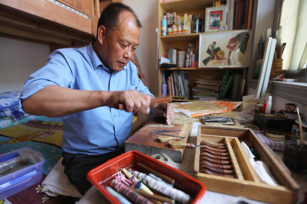 6月25日,通渭影子腔传承人刘满仓在通渭县常家河镇自己家中雕刻皮影戏影件。